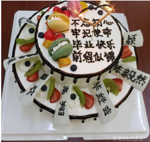 会议现场,一个下层摆有9位毕业生党员姓名,上层写有“不忘初心,牢记使命,毕业快乐,前程似锦”话语的蛋糕格外引人注目。高坤介绍道,“九个名字代表着大家曾经在同一集体努力奋斗过;上层的话语则表达了支部对毕业生党员们的美好祝愿。”高坤为全体毕业生党员们切分蛋糕,并勉励大家在踏上新的学习和工作岗位后,要勇于担责,时刻不忘党员身份,用奋斗书写青春最美的华章。