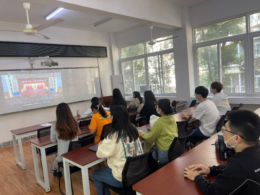 大会开始,师生们随着习近平总书记及委员代表全体起立,一起奏唱国歌。之后认真听习近平总书记的汇报,并做笔记,同时就报告内容作心得体会总结。线上观看的师生也在实时关注会议进程并交流,一起迎接二十大的顺利召开。