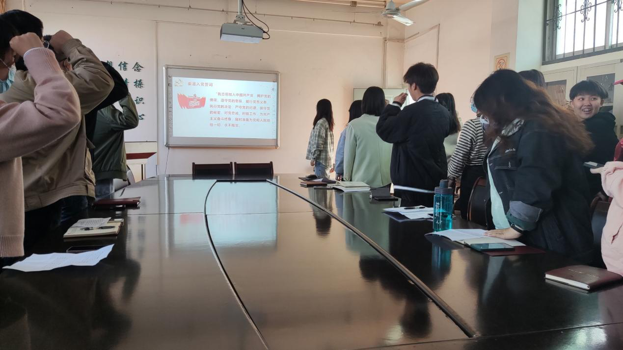 宣誓仪式开始前,老党员为新党员戴上了象征党员身份的党员徽章。宣誓仪式正式开始,在领誓人罗霄同志的带领下,宣誓党员面对党旗,举起右拳,用激昂的声音庄严宣誓:“我志愿加入中国共产党,拥护党的纲领,遵守党的章程,履行党员义务,执行党的决定,严守党的纪律,保守党的秘密,对党忠诚,积极工作,为共产主义奋斗终身,随时准备为党和人民牺牲一切,永不叛党!”新党员依次响亮地报出自己的名字,他们将终生铭记这一光荣时刻。