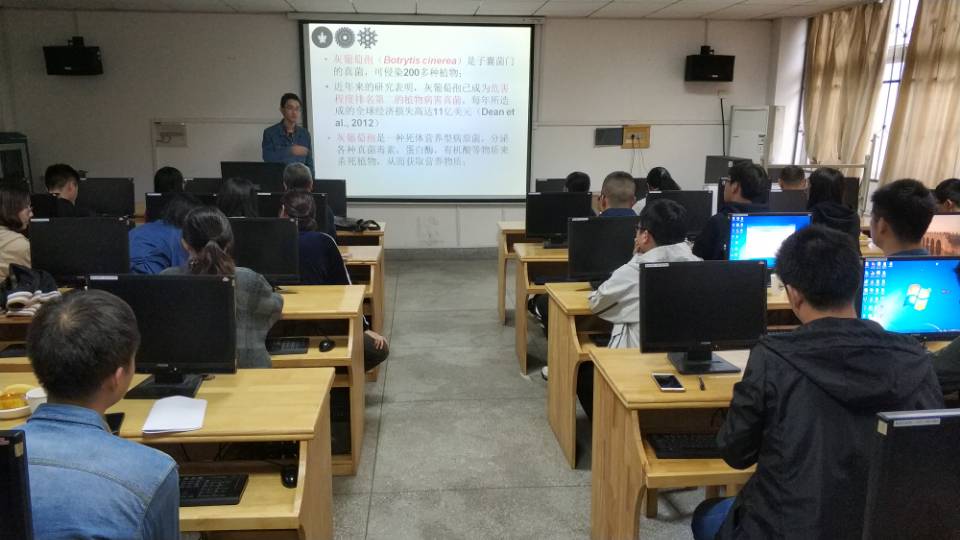 朱闻君老师首先地介绍了灰葡萄孢的结构、功能、侵染植物的方式及其机制等相关知识,接下来就具体的几个分泌蛋白及其通路做了详细介绍。详细阐述了发现BC1G-00594、BCXYG1、BC1G-01444、BC1G-02932等蛋白的研究方法思路及结果与讨论,并在每一部分讲解结束后做了总结。报告中,朱老师巧妙运用生活中常见的例子生动形象地进行阐述,让复杂的机制通俗易懂,给广大师生们留下了深刻的印象,也给广大师生们提供了试验相关的经验和创新思路。
