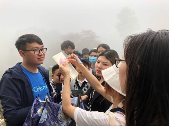 孔祥雨:我们班是由彭焱松老师带队。彭老师带领我们认识了许多平时常见的路边野草,当然还有更多的珍稀植物,主要认识了许多品种的杜鹃、杉树和柏树,我和同学拍照和记录了很多种植物,学习到了许多认植物的技巧,也头一次见到了山里的云雾缭绕。同时也被彭老师所介绍的三老等先驱者的故事引发思考。老师们的体力都很好,讲解也很细致,这使我认识到锻炼身体的必要性。同时老师说认植物和记单词一样,要多重复多练习,认清主要特征,我深有感触。