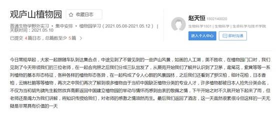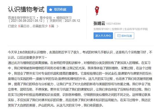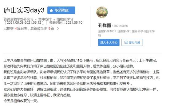 张晴云:在老师的带领和讲解中,对植物的分类及辨别有了更加深入的理解。在实习中,我们常常被各种植物的不同形态吸引着,让我记忆尤深。我亲身体验了辨别植物、采集过程,在这个过程中,我领会了野外实习对专业的巩固和提高的重要性。它是检验理论的一块试金石;是课堂内与课堂外的互补;是理论与实践的统一;是教与学的互动;是感性和理性的升华。这几天的实习过程,也培养了我们吃苦耐劳的精神,提高了我们的综合与分析能力,让我们产生了对大自然的新奇与美丽的惊叹与热爱之情。我们学会了独立思考、团结互助、不停探索。野外实习巩固了我们的课堂知识,让我们亲自体验了压制标本的过程。我们在实习过程中积极运用课堂知识去观察、识别各种植物、仔细辨别类似植物之间的不同之处。这样理论联系实际,不仅加深了我们对课本知识的印象,而且培养了我们对课本知识的运用能力。在实习过程中,我还欣赏到了大自然的美丽,庐山的风光。从这几次的实习中,我们收获颇多。