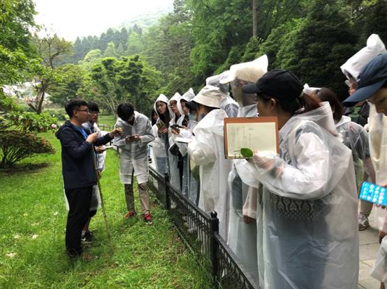 10日一早实习队伍来到中国科公司庐山植物园。“人间四月芳菲尽,山寺桃花始盛开”,时任江州司马白居易在庐山大林寺写下这千古名句,充分表明了高海拔地区物候因温度差异较平原地区的滞后性。本次实习从以往的6月调整到5月,刚好赶上庐山的花期,强化了本次植物学实习的效果。