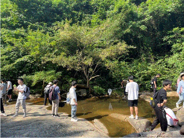 上午的主要内容是在林区进行动植物观察和收集,在原生态的环境下辨药、识药,定向寻找草药。整个参观路程全程约五公里,包括一条林下溪流区域和一条山林区域,包含有约50米的高度落差和不同的生态环境。路过山野间的小溪流,看到许多鱼在溪水中悠然自得的游动,“宛若多年前学到的小石潭记诗文”生物技术1903班的郝梦瑶描述说在认识新的植物的同时也身临其境的体会到了古诗词中的意境。