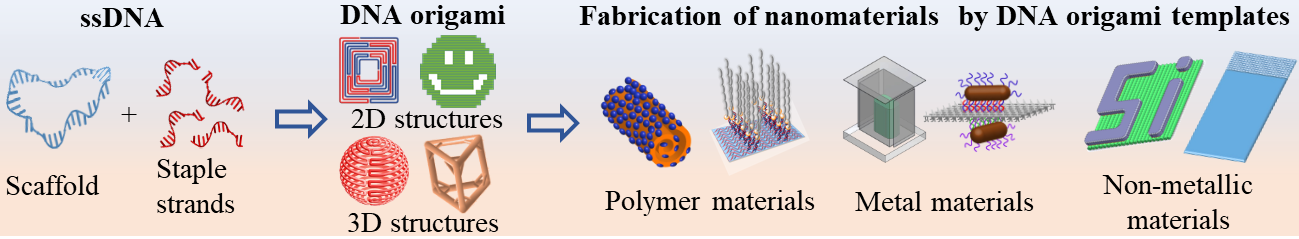 DNA折纸术是近年来发展起来的一种DNA自组装技术,主要通过一条长单链DNA自组装或与若干短链DNA互补配对组装形成具有特定形貌和尺寸的DNA纳米结构。近十多年的发展使该技术所能制备的纳米结构,已经由简单的二维图形(如二维片、笑脸等纳米图案)拓展到了复杂的二维图形如海豚结构,甚至更复杂的三维纳米结构。DNA折纸具有可编程以及可寻址等特性,可作为模板应用于各种纳米材料的精细化制备,从而给纳米材料科学领域带来了潜在的革命。