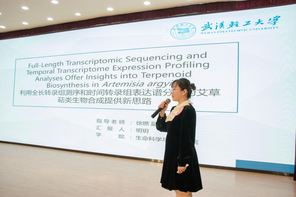 在报告会中,明玥同学汇报了研究——《Full-Length Transcriptomic Sequencing and Temporal Transcriptome Expression Profiling Analyses Offer Insights into Terpenoid Biosynthesis in Artemisia argyi》,通过GC—MS的方法对艾草的代谢产物进行检测,以及根据艾草转录组和代谢组学关联分析,筛选出关键基因,判断这些基因在挥发油合成代谢途径中的调控功能。该研究为今后通过生物合成相关目标化合物或培育优质艾草品种奠定了一定的科学基础。
