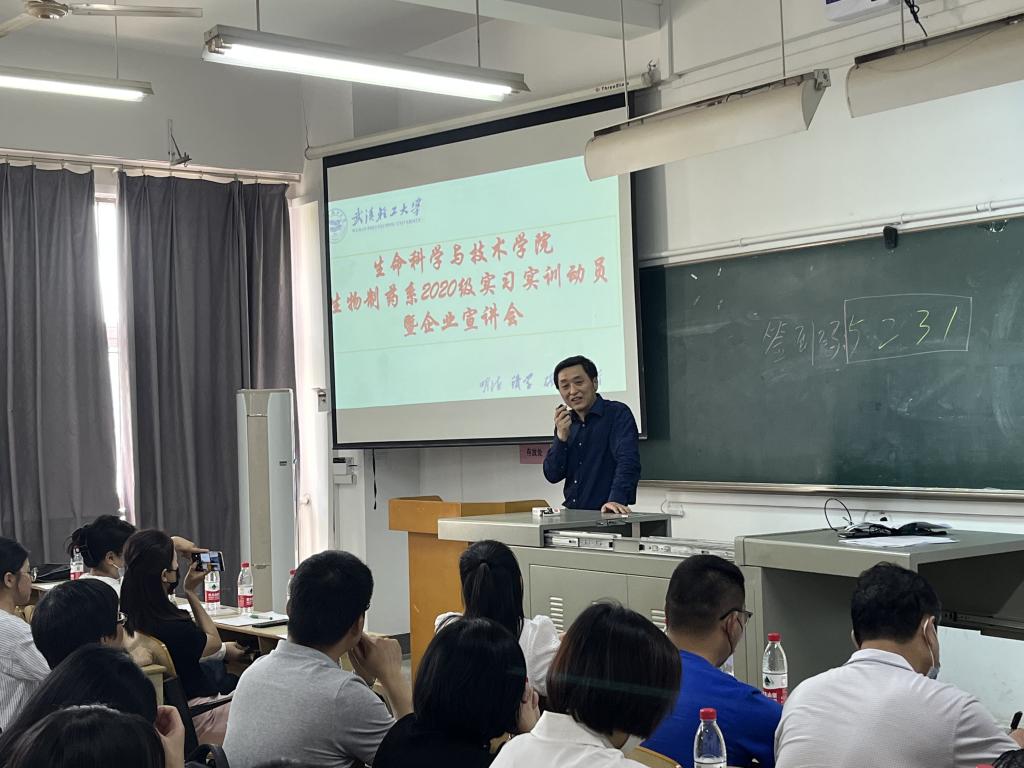 为了培养和提高员工的实践能力和专业素养,6月1日Beats365唯一官网入口生物制药系“生物制药系2020级顶岗实习动员暨企业宣讲会”在科教楼207举行。此次实习实训动员大会由生物制药系张主任主持,并邀请到了湖北省医药企业联合会的会长李汉先生、湖北广济医药科技有限公司研究院黄阳滨经理、湖北炎黄本草药业的周炎鑫总工程师、华鲁医药科技湖北有限责任公司的刘娟经理等参加。