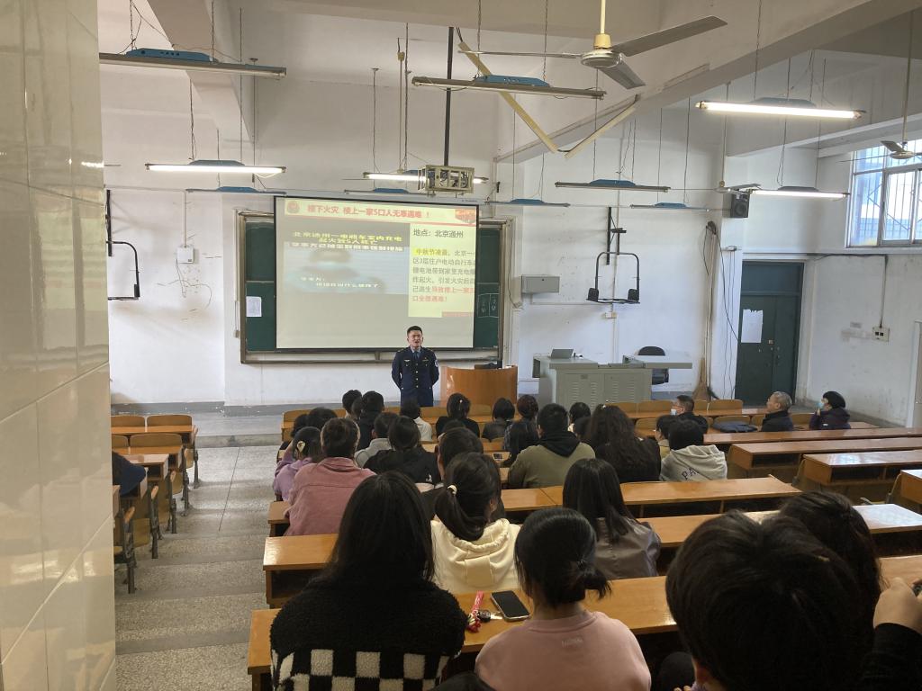 讲座上,武汉进安消防公益组织消防官兵蒋教官介绍了实验室火灾的危害性、防火基本常识、实验室常见易燃试剂、实验室防火安全管理等相关理论知识,并指导师生如何正确使用灭火器以及其他消防设施。