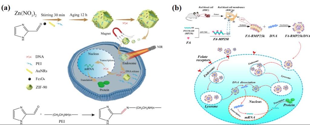 课题组通过对ZIF-90进行表面修饰构建了一种智能递送载体AFZP25k (Fig. 1a),在近红外辐射和微酸性环境中表现出优异的DNA释放能力,并具有较高的生物相容性、细胞摄取和转染效率(Construction of intelligent response gene vector based on MOF/Fe3O4/AuNRs for tumor-targeted gene delivery, Int. J. Biol. Macromol.277 (2024) 134313. https://doi.org/10.1016/j.ijbiomac.2024.134313)。将PEI通过二硫键与红细胞膜交联,接枝叶酸后得到FA-RMP25k载体(Fig. 1b),该载体具有谷胱甘肽响应和肿瘤靶向性,结果表明,FA-RMP25k/DNA具有较高的细胞摄入和转染效率(PEI functionalized cell membrane for tumor targeted and glutathione responsive gene delivery, Int. J. Biol. Macromol. 255 (2024) 128354. https://doi.org/10.1016/j.ijbiomac.2023.128354)。在上述基础上,课题组进一步以PEI为载体,Fe3O4为磁源,植物提取物Zein为结构单元,以透明质酸为靶向开关,设计了一种安全、低毒的磁性基因靶向递送载体(Fe3O4/Zein/PEI25k-HA)用于基因的高效递送和表达(Layer-by-layer nanocomposite based on zein and hyaluronic acid for tumor-targeted gene delivery, Ind. Crop. Prod. 222 (2024) 119445. https://doi.org/10.1016/j.indcrop.2024.119445)。这些工作有望为基因递送系统的发展提供新的见解。