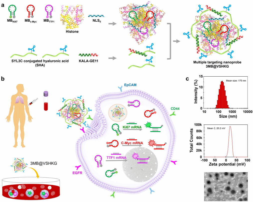 韩笛博士及所在团队开发了一种利用恶性细胞靶向纳米探针进行肺癌诊断的精确血液活检技术。该纳米探针可以同时检测各种在特定类型的肺癌中表达的标志物,不仅可以降低由循环恶性细胞(CMC)高度异质性引起的假阴性率,还可以准确了解个体患者CMC的特定异质性。纳米探针可以区分肺腺癌(LAD)以及小细胞肺癌(SCLC)与鳞状细胞癌(SCC)。此外,这种方法可以灵敏地识别临床上归类为非浸润性原位癌的早期病变中的恶性细胞。该技术在肺癌的早期检测和精确表征方面具有重要的临床潜力。重要的是,该策略适用于检测其他生物标志物,从而将其适用性扩展到各种癌症类型的诊断。