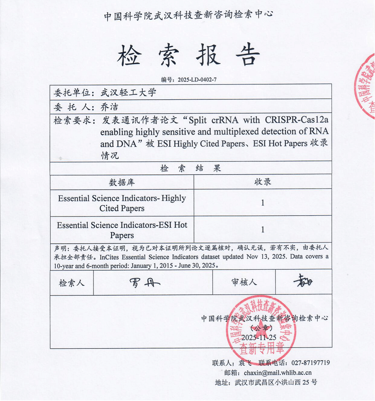 该研究通过创新性地拆分CRISPR/Cas12a系统的crRNA,建立了高灵敏度的核酸多重检测新平台。ESI(基本科学指标)作为国际权威学术评价工具,其高被引论文遴选近10年学科前1%的顶尖成果,热点论文则聚焦近2年学科前0.1%的前沿研究,两项指标每两月动态更新,共同构成衡量学术影响力的黄金标准。