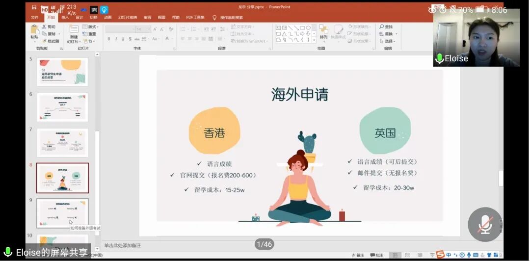 龙宇学姐为大家分享了海外研究生申请的经历并介绍了海外申请的相关事宜及注意事项。同时她为如何准备外语考试做出了详细的解答。她指出,外语学习应注重听、说、读、写四个方面,而不是某一个环节的单独的学习。