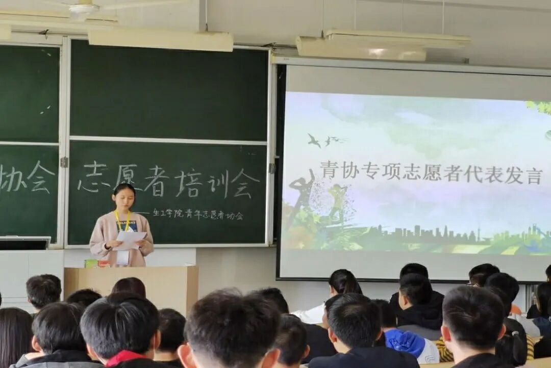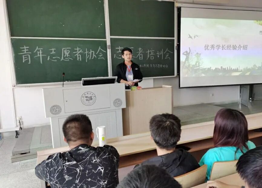 在经过简单的青协人员自我介绍后,培训会主持人介绍了青协曾获得的荣誉。其中“花朵计划”曾在《武汉晚报》报道,参与的志愿者们被评为校优秀志愿者团队。随后进行了青协专项志愿者代表发言,提到希望能在志愿活动中收获友谊,温暖和爱。在优秀学长经验介绍部分,生工公司分团委员工会分管主席彭红星学长分享了他的经历,他希望志愿者们能牺牲课余时间参加志愿活动,能保持志愿精神,保持真心和热心。他还给新志愿者们讲述了自己在大一参加“花朵计划”的志愿经历,告诫新志愿者们要用心体会志愿活动,热心帮助他人。最后全体志愿者们进行了宣誓,庄重的誓言体现了他们对加入青年志愿者协会的坚定。