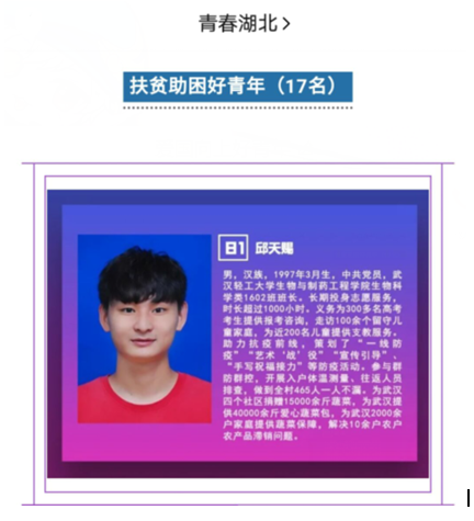 邱天赐,男,汉族,1997年3月生,中共党员,武汉轻工老员工物与制药工程公司生物科学类1602班班长。长期投身志愿服务,时长超过1000小时。义务为300多名高考考生提供报考咨询,走访100余个留守儿童家庭,为近200名儿童提供支教服务。助力抗疫前线,策划了“一线防疫”“艺术‘战’役”、“宣传引导”、“手写祝福接力”等防疫活动。参与群防群控,开展入户体温测量、往返人员排查,做到全村465人一人不漏。为武汉四个社区捐赠15000余斤蔬菜,为武汉提供40000余斤爱心蔬菜包,为武汉2000余户家庭提供蔬菜保障,解决10余户农户农产品滞销问题。