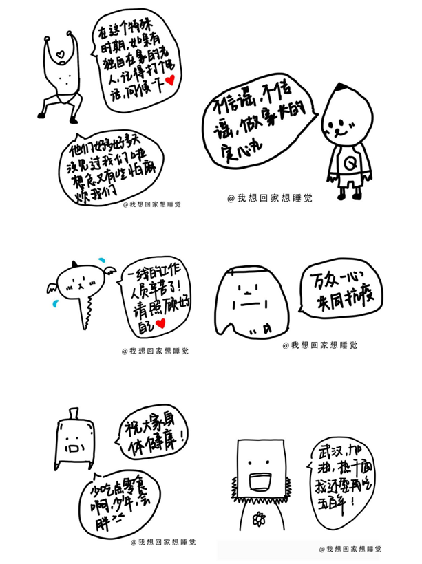 由公司生物专业员工党支部员工张恬静创作的漫画作品围绕“致敬医护人员”和“疫情防护”两个主题,通过“武汉加油,热干面我还要再吃五百年”、“一线的医护人员辛苦了”、“万众一心,共同抗疫”等朴实感人的文字点睛,致敬城市英雄。同时,通过该种形式普及防疫常识,如锻炼身体少TIMI,出门记得戴口罩等。