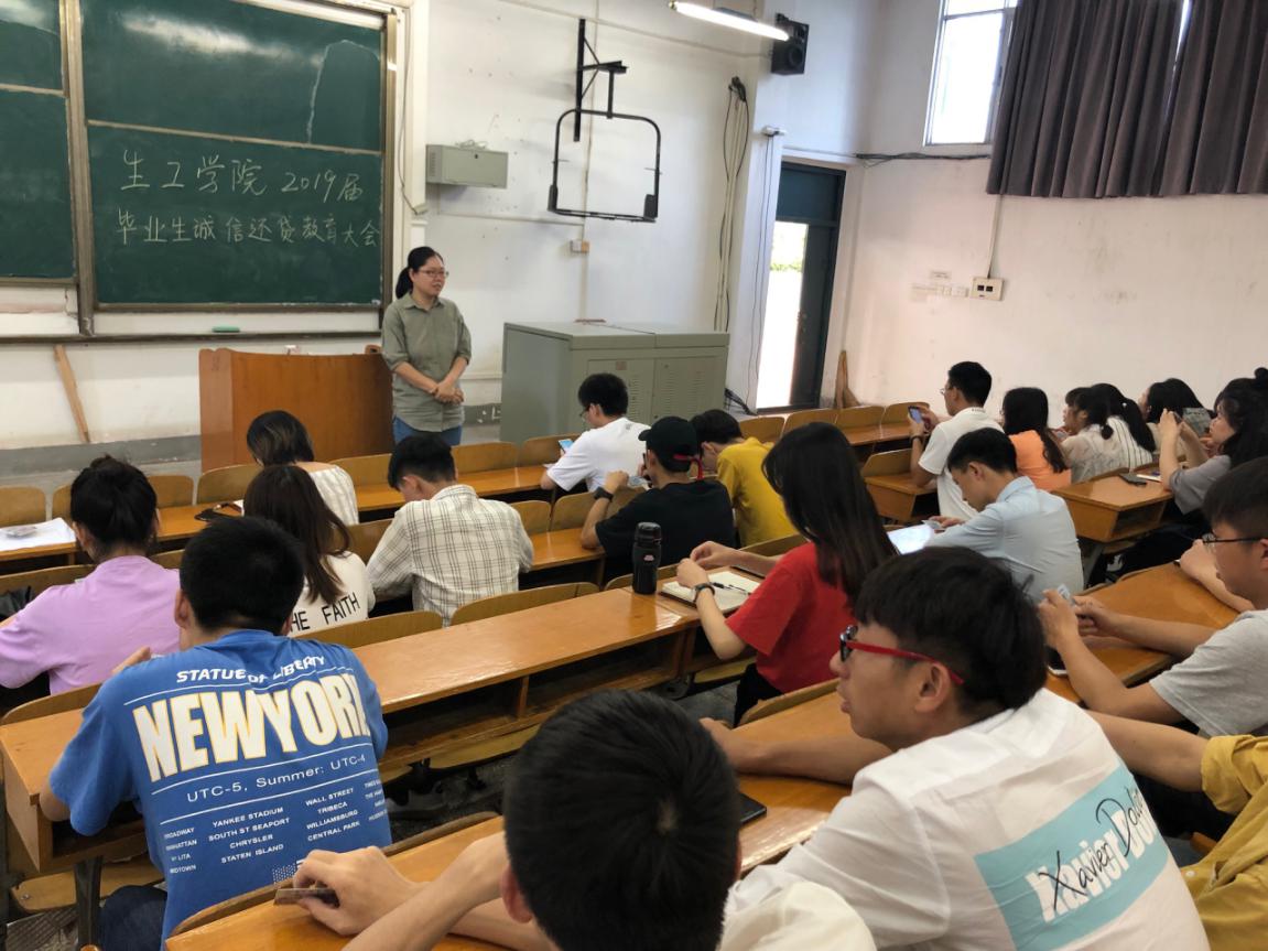 为进一步落实好毕业生贷后管理工作,加强贷后管理,完善还款机制,同时加强毕业生的诚信教育,提高员工守信用重承诺意识,更好促进毕业生立德成才,生工公司于2019年5月31日在医护楼二楼电教室举办2019届毕业生诚信还贷教育大会,毕业班辅导员叶青、高坤以及申请助学贷款的2019届毕业生参会。