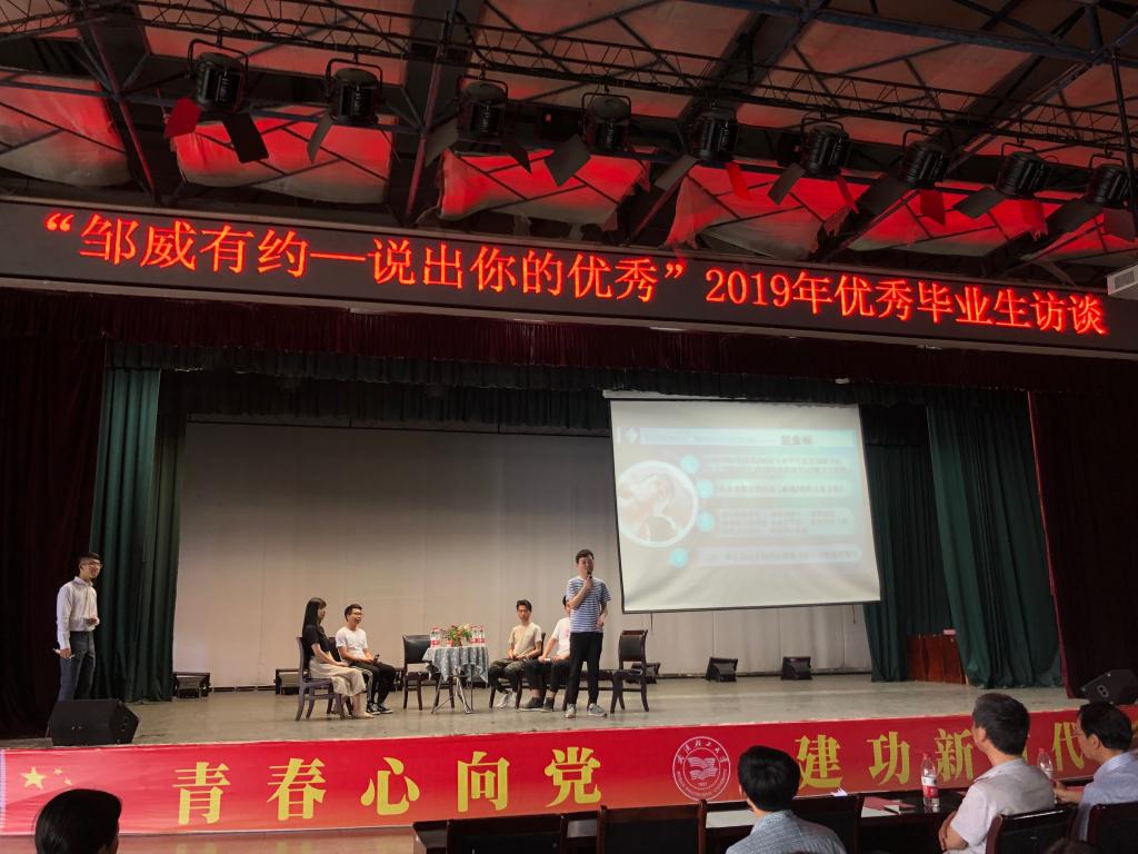 为了发挥优秀毕业生的模范带头作用,传播优良学风,丰富同学们对求职和考研的认知,生工公司于2019年5月23日15:00在常青校区老员工活动中心举行了“邹威有约,说出你的优秀”——2019年优秀毕业生访谈活动。参加本次活动的特邀嘉宾是2019届优秀毕业生赵金标、王承然、包玉婷、黄程鹏、郭子琪。