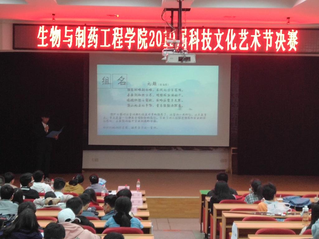 为了培养同学们的科技创新意识,锻炼同学们的实践能力,充分展现公司专业特色,营造良好的校园氛围,2019年4月29日晚18:30由生工公司分团委科技创新与创业协会举办的"扬科技创新精神,展‘轻’春艺术风采"科技文化艺术节决赛于科学报告厅顺利举办。此次到场的评委及嘉宾有生工公司分团委书记叶青老师,中外班辅导员高坤老师和分团委员工会主席团成员。