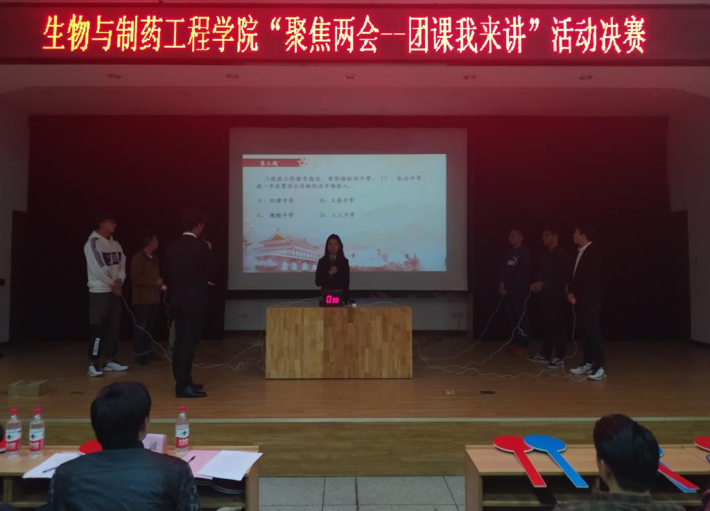 为了让广大青年团员了解国家热点时政,落实“三会两制一课”,充分发挥基层团组织的战斗堡垒作用,提高团员青年对基层团组织的认同感和归属感,生工公司分团委组织部于2019年3月31日晚6:30在科学报告厅成功举办"聚焦两会——团课我来讲"决赛。