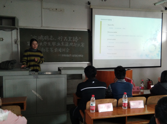 主持人简短的介绍了此次培训会的目的后,由邹威老师为同学讲述职业规划大赛的流程和意义。老师最先提到的就是老员工职业生涯规划的概念,即根据时代特点和自己的职业倾向来确定最佳职业目标。紧接着老师向参赛选手介绍了撰写生涯书的方法。写生涯书不仅要从各个方面认识自己,还要搜罗资料了解所选行业的发展空间和国家政治导向,这就是所谓的“知己知彼”。除此之外,邹老师还十分贴心的分享了一些参赛技巧,如向评委介绍自己时可先讲一个故事来引起评委的感情共鸣,结尾部分拔高眼界,将内容进一步升华等。最后,老师着重强调了比赛之外的意义。举办比赛的初衷就是锻炼每一位参赛选手语言表达,情绪控制,制作PPT等方面的能力。希望所有的参赛选手可以通过这次比赛成长自我,完善自我。
