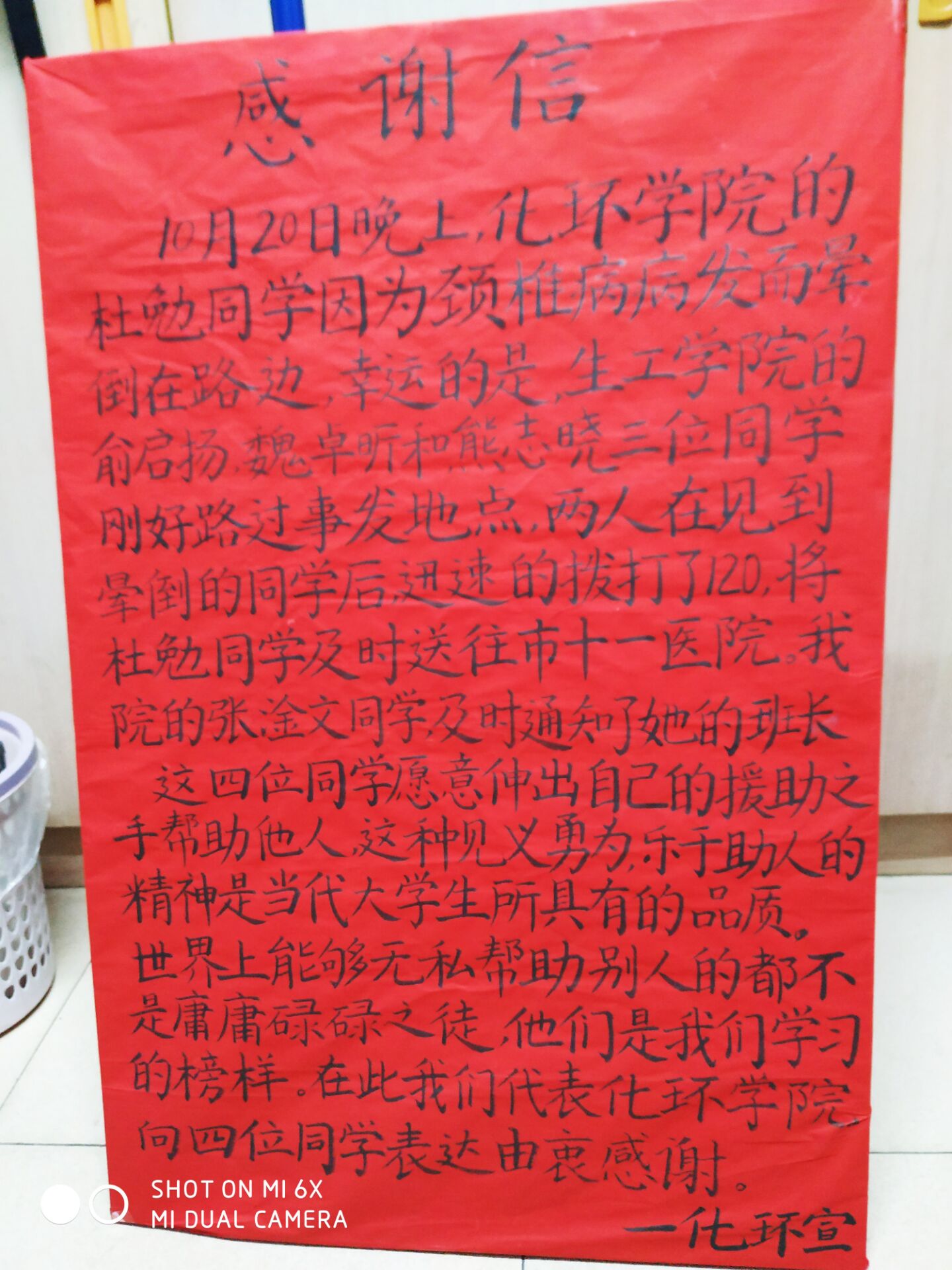 2018年10月20日晚19点左右,天色渐晚,生工公司药物制剂1601班的俞启扬、熊志晓、魏卓昕三位同学在从生化楼实验室回常青公寓的路上,突然看到一个人晕倒在常青花园十小区西门对面的人行道上,由于不知道该女生晕倒的原因,也无法辨别其身份,所以三位同学有些手足无措。