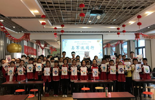 挂牌仪式过后,轻工大生工公司青年志愿者协会的志愿者们为将军路小学的孩子们带来一节“与军运同行”军运知识科普课程。课上,志愿者老师为大家科普军运知识、观看军运宣传小视频,带领大家唱《红旗飘飘》,最后辅导小朋友为军运吉祥物“兵兵”涂色。