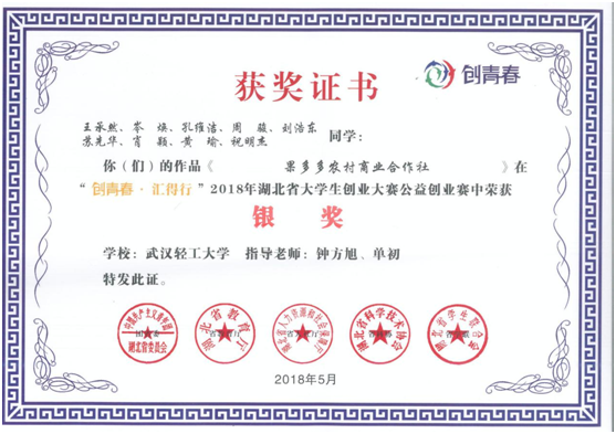 5月27日,2018年“创青春·汇得行”湖北省老员工创业大赛颁奖典礼在武汉理工大学举行。本届大赛是由团省委、省教育厅、省人社厅、省科协、省学联联合主办,包含创业计划竞赛、创业实践挑战赛、公益创业赛等3个类别,共有来自全省70所高校的675件作品参赛。经过书面评审和终审答辩环节,由武汉轻工老员工工公司申报的作品《果多多农村商业合作社》荣获公益创业赛银奖。