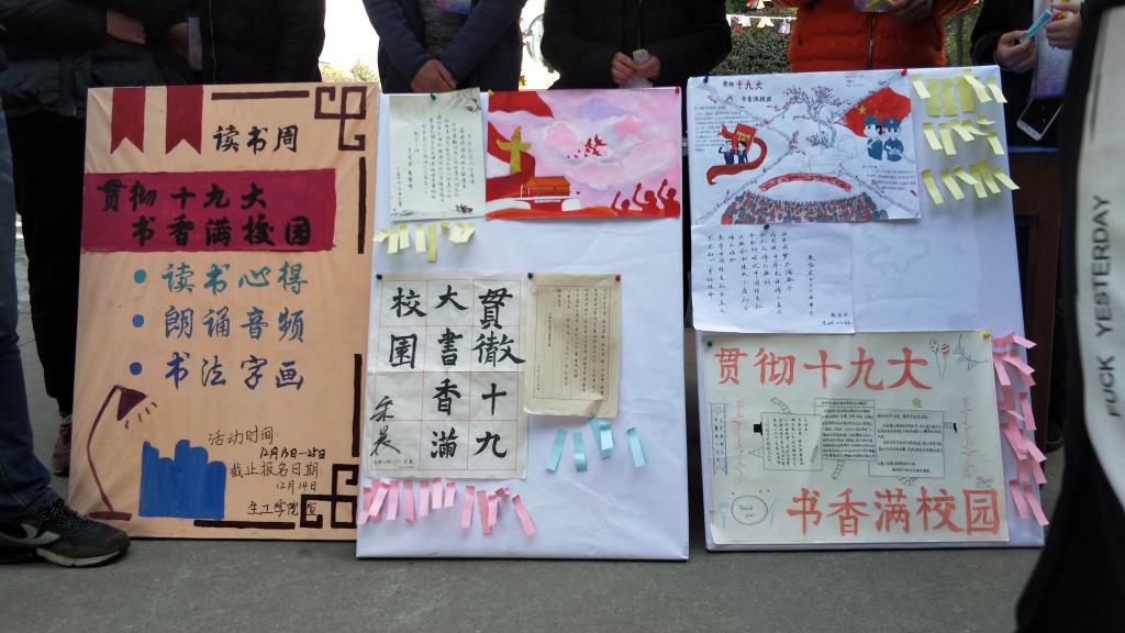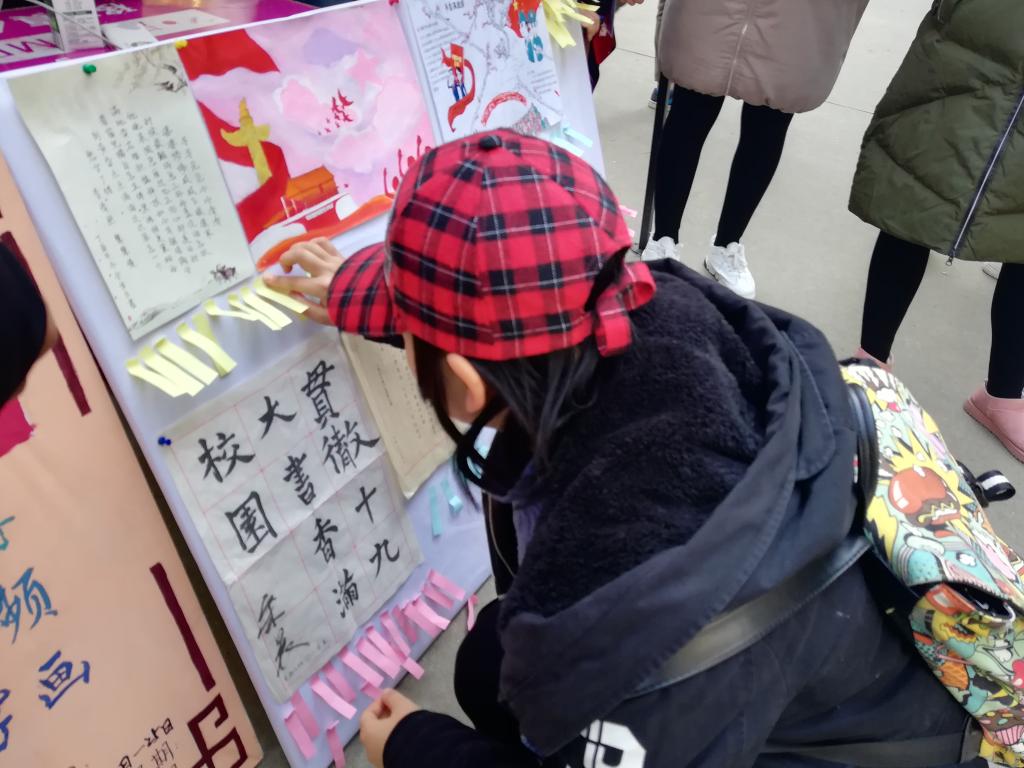 本次的外场活动将选手们的优秀作品展示出来让大家学习,不仅让同学们欣赏到一手手漂亮的书法,一幅幅精美的图画,更营造了一种良好的读书氛围,有利于提高同学们的文化素养。