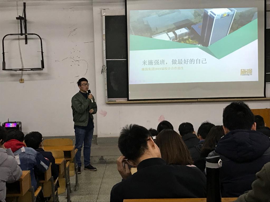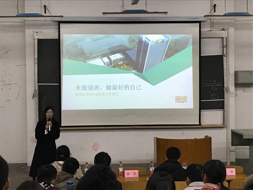 施强集团成立于1995年2月,总部坐落于中国杭州国家高新技术产业开发区,是一家集医药、教育、出国中介、网络科技、物业管理等多个业务领域的集团公司,拥有中、外高素质员工3000余人,是国家高新技术企业、杭州高新(滨江)区重点税源企业之一。本次宣讲会从施强班、了解施强、施强产业、人在施强四个方面进行宣讲,徐老师谈到:除了基础课程的授课,培养期间每学年还安排有着非常丰富经验的大区总监级别讲师进行授课2次,邀请企业高管到公司进行高管面对面沙龙1次。通过公司高层领导的授课及沙龙,加深员工对企业和职场的了解、明确员工未来职业规划、引导员工树立正确的职业心态,最终达到提高员工综合素质及市场竞争力的培养目标。