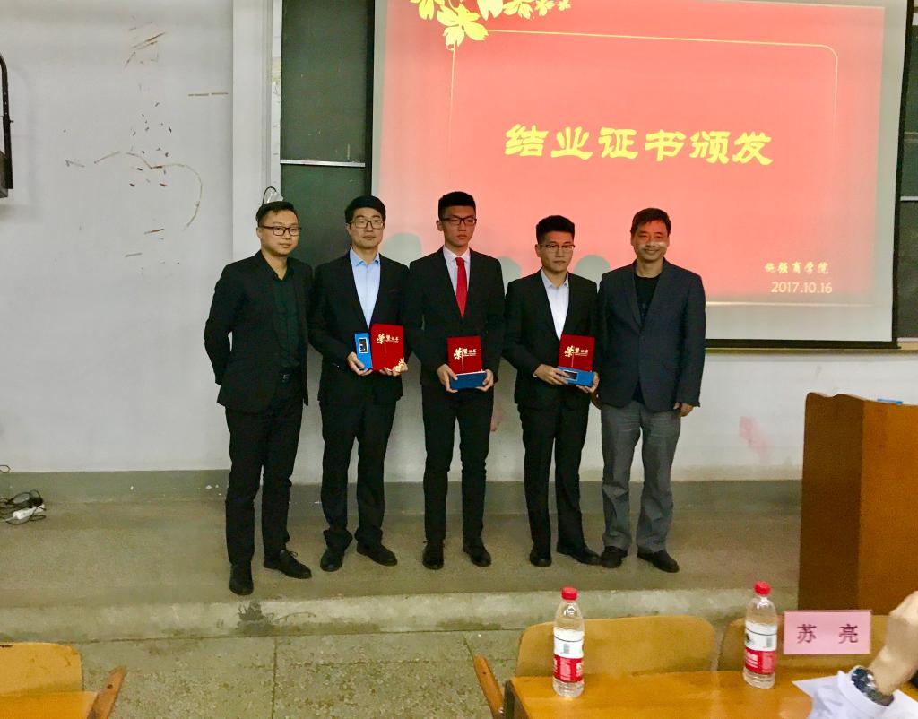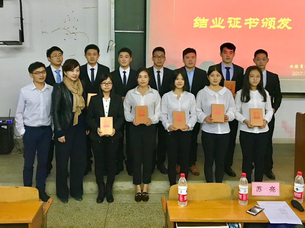 会议伊始,主持人黎潇宇老师向在座的同学们郑重的介绍了莅临此次结业典礼的领导和老师们。经过了一年的学习,施强班的同学们终于顺利结业,紧接着,施强集团魏利飞经理向大家大声宣读了结业名单和优秀学员名单。苏经理与李书记随即为顺利结业的29名同学颁发了结业证书,魏经理和严书记对3名优秀学员进行了颁奖,此时此刻,同学们的喜悦之情不言而喻。