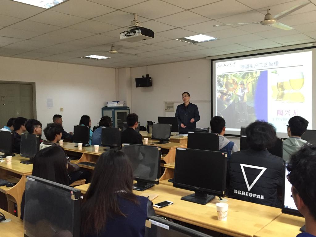 讲座伊始,陶老师言简意赅向同学们介绍了啤酒的生产过程,让同学们对于啤酒的生产过程有了基本的概念理解。随后陶老师向同学们介绍了啤酒的主要种类、酿造工艺和各自独有的特点。陶老师说制作啤酒对于原材料的要求很严格,每一瓶啤酒的生产都要经过严格的制作、检查和包装等工序,只有经历一次又一次严格加工才可制出味美甘醇的啤酒。最后,陶老师深入讲解了啤酒的风味特征和品位啤酒的要点,例如:啤酒的气泡最重要,啤酒不能倒满等等细致而有趣的细节要求。