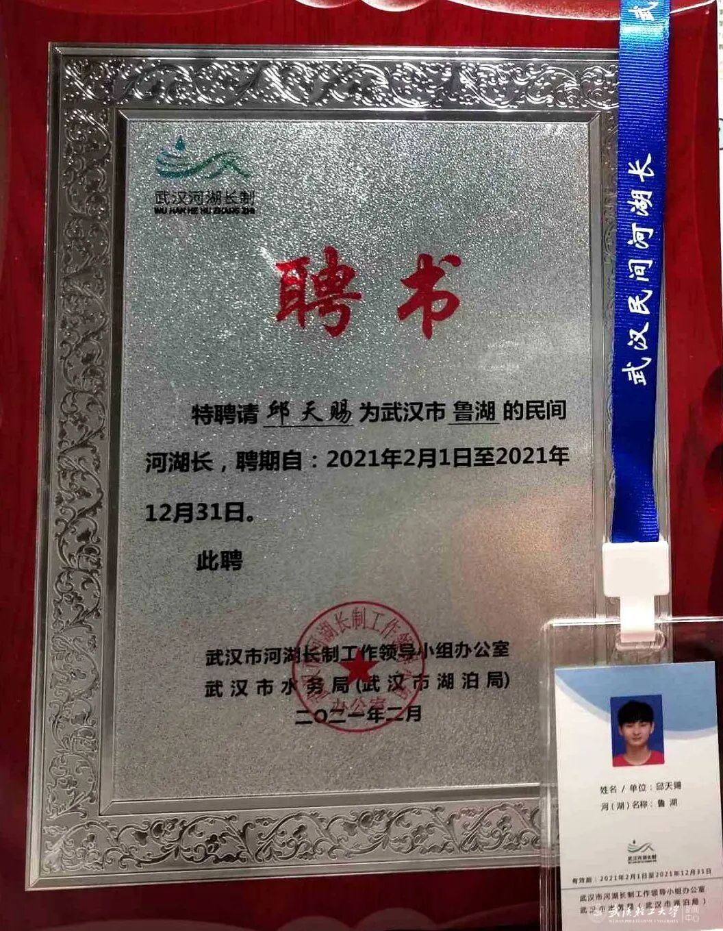 3月22日为“世界水日”,23日上午,武汉市2021年度市级重点河湖民间河湖长聘任暨长江民间河湖长驿站揭牌活动在汉口江滩江汉门举行。公司邱天赐同学被聘为金水河和鲁湖两个市级重点河湖民间河湖长,接受省水利厅、市水务局、市生态环境局及市农业农村局等有关领导为其颁发证书和授旗。揭牌仪式上,邱天赐作为河湖长代表作主题发言。