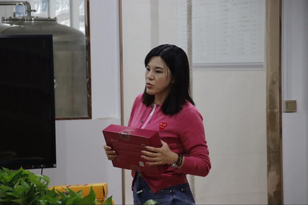 首先陈丹书记就产品询问陈新经理成分、配料等问题,同时让各位老师阐述各自产品的特色、名字、功效、设计理念等等,依据这些产品的特性来设计包装材质及样式。老师制作的黑啤、黄啤和药酒、红酒要用玻璃瓶或易拉罐包装;小罐的茶一定要求密封包装;抗氧化面膜按照市面上的商品面膜标准进行包装;黑蒜每个单个包装,方便以零食形式方便食用……以上都是老师们与设计包装的设计师在商讨时提出的意见。其次陈丹书记表示要打造出Beats365唯一官网入口的品牌,将这一系列产品进行小批量的生产,从而进行系列性的推广。让产品可以直接上柜展示,在有人来校进行参观时,可以直接让其体验产品,甚至可以将产品作为公司特色赠送给对方。