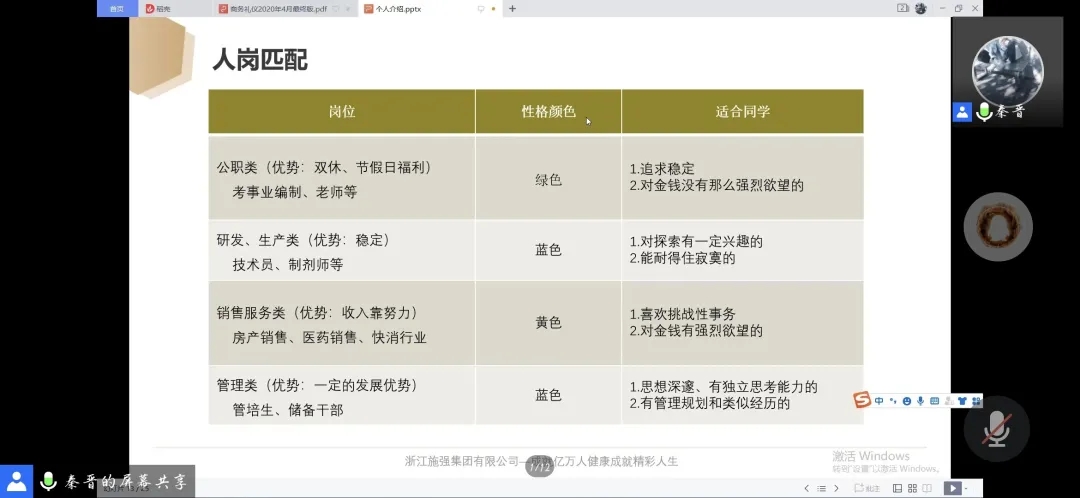 秦晋分别从人岗匹配,简历书写,面试流程,个人工作经历分享四个方面介绍了就业时的注意事项,分别阐述了应该如何选出与自己的性格相匹配的岗位,在写简历时应当侧重的部分和简略的部分,面试官面试的大概流程以及在面试时最需要注意的压力面,并根据自己的工作经历向大家分享了一些自己的心得体会。