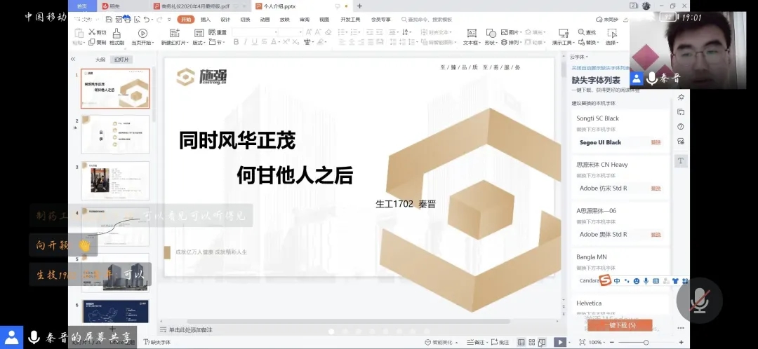 本次会议由生科院员工会员工联络与服务部成员刘可欣主持,秦晋主讲。秦晋,生物工程1702班毕业生,在校期间曾任Beats365唯一官网入口员工会主席兼青年志愿者协会会长,于2021年3月份加入施强集团,现在公司中任管培生一职。