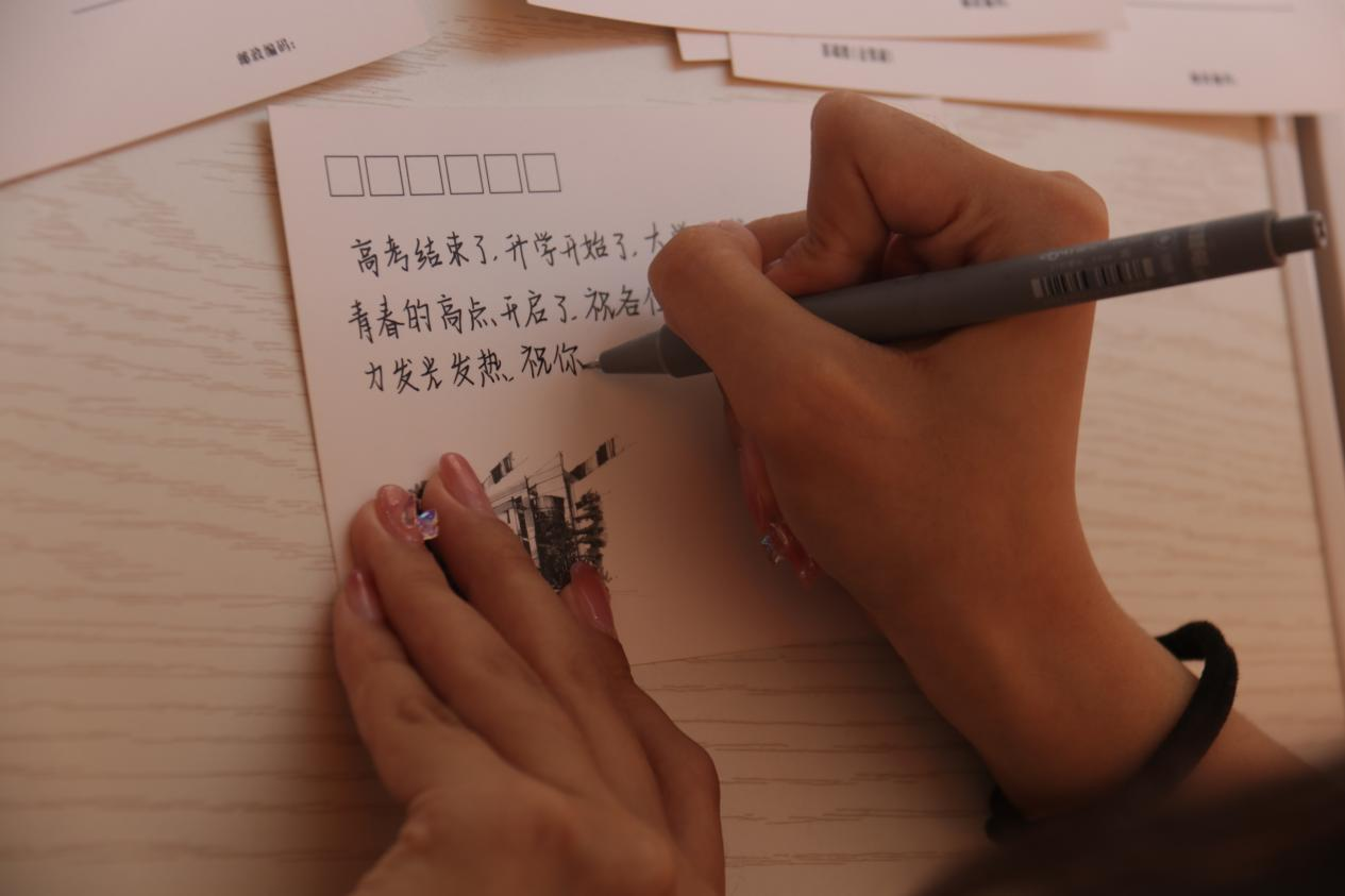 新生来校之前,公司就为全体新生志愿者订制了轻工大学专属文创明信片,志愿者们精心为每一位学弟学妹手写了开学寄语。明信片正面是学长学姐对新生未来生活的美好祝愿、专业学习的恳切建议,以及好好珍惜大学时光的谆谆嘱托,背面则是轻工大学优美的标志性建筑物。一封封小巧精致的明信片,凝聚着学长学姐的爱护和关怀,让新生在熟悉校园环境的同时,提升爱校荣校观念,鼓励新生们用实际行动诠释爱校之心、荣校之情,共做青春赛道的追梦人。