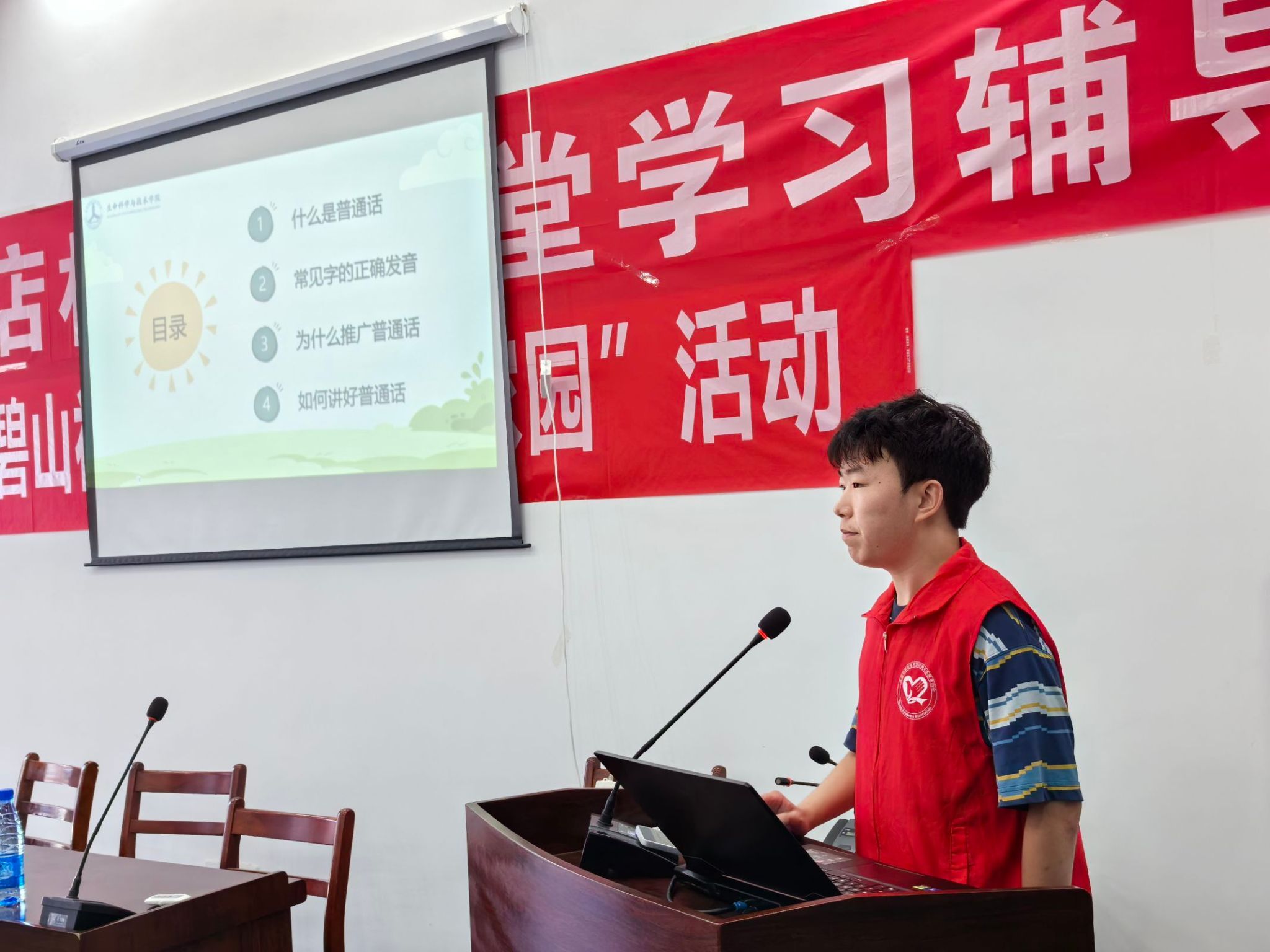 在“普通话推广”主题宣讲中,志愿者们以生动有趣的方式,向同学们展示了普通话的魅力,激发了大家学习普通话的兴趣。志愿者们还现场示范了标准的普通话发音,帮助同学们纠正方言音,提高普通话水平。此外,志愿者们还鼓励同学们在日常生活中积极使用普通话,传承中华民族优秀传统文化。