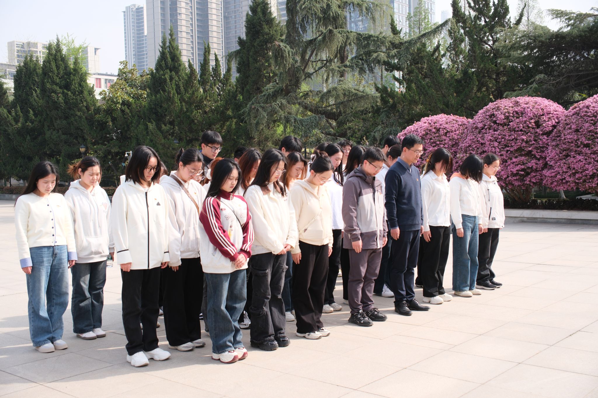 下午两点,二七纪念馆广场庄严肃穆。师生们整齐列队,面向革命烈士纪念碑肃立默哀。校青马工程学员刘奥灿、张天进代表全体师生敬献花篮,表达对林祥谦、施洋等在“二七”斗争中牺牲的革命烈士的深切缅怀。
